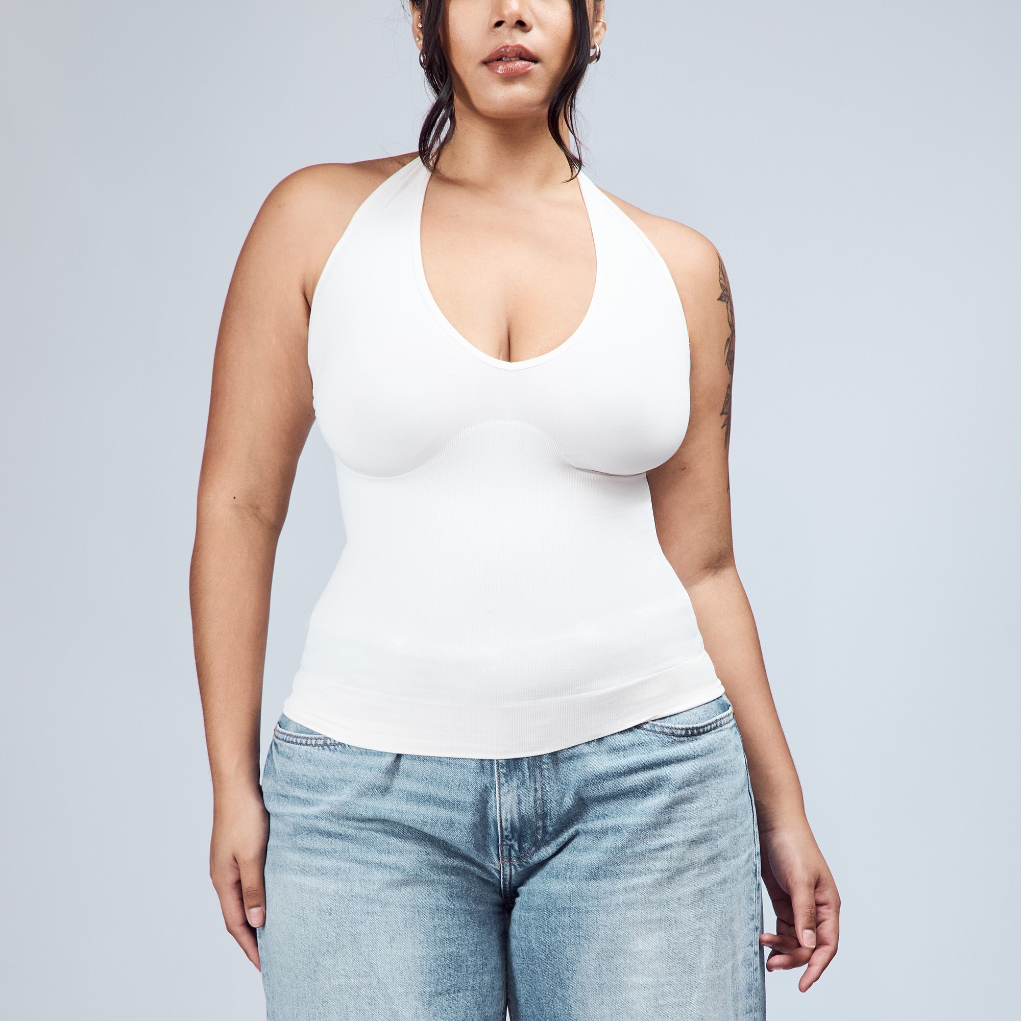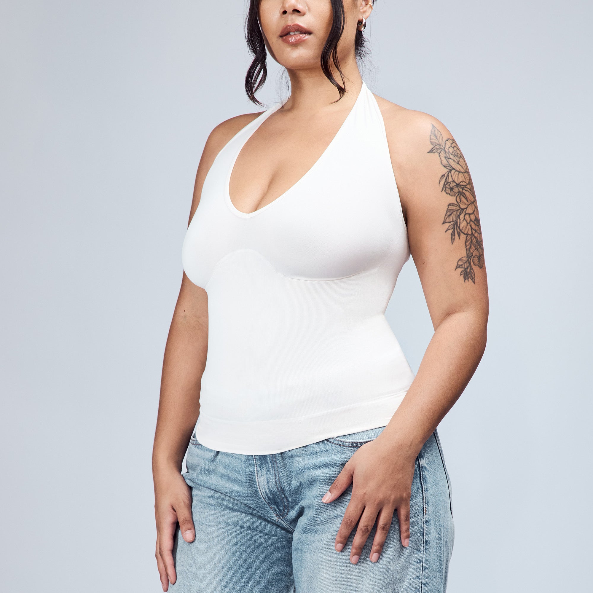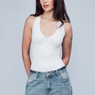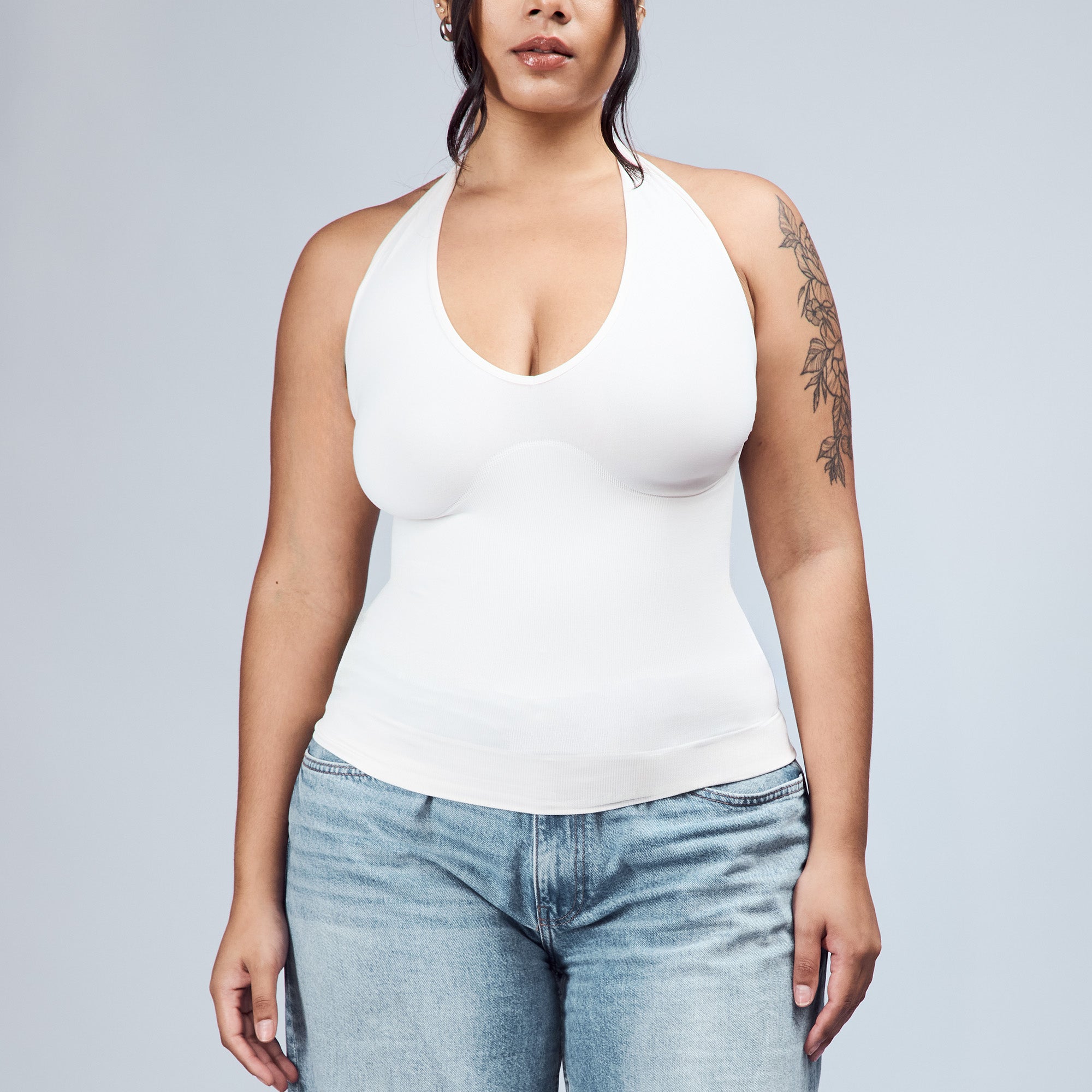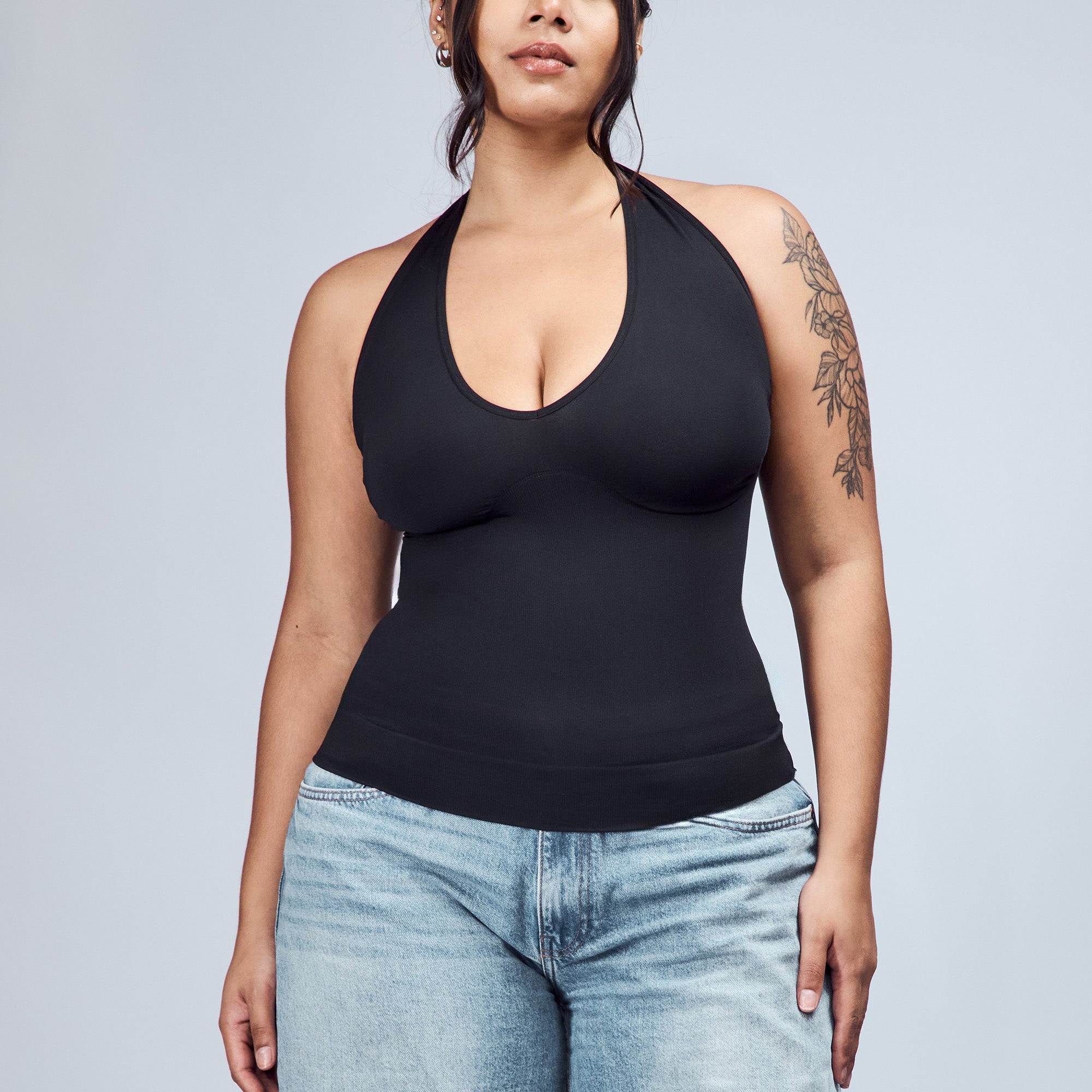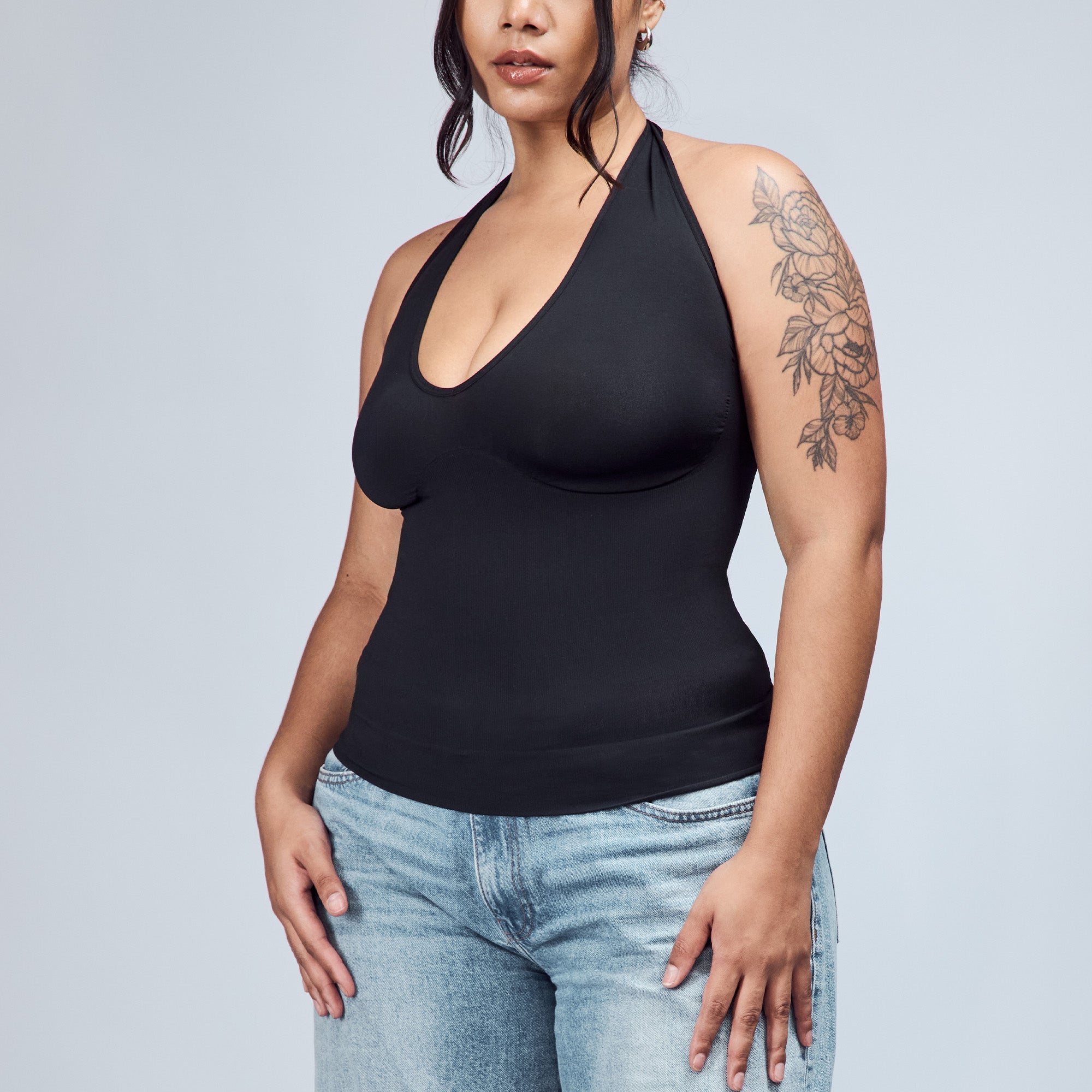 The Hugging Halter Top is a medium-compression shapewear with a flattering plunging neckline and a low-back silhouette. It offers a snug yet comfortable compression through the waist. Versatile and easy to wear, it’s perfect for layering or styling on its own.