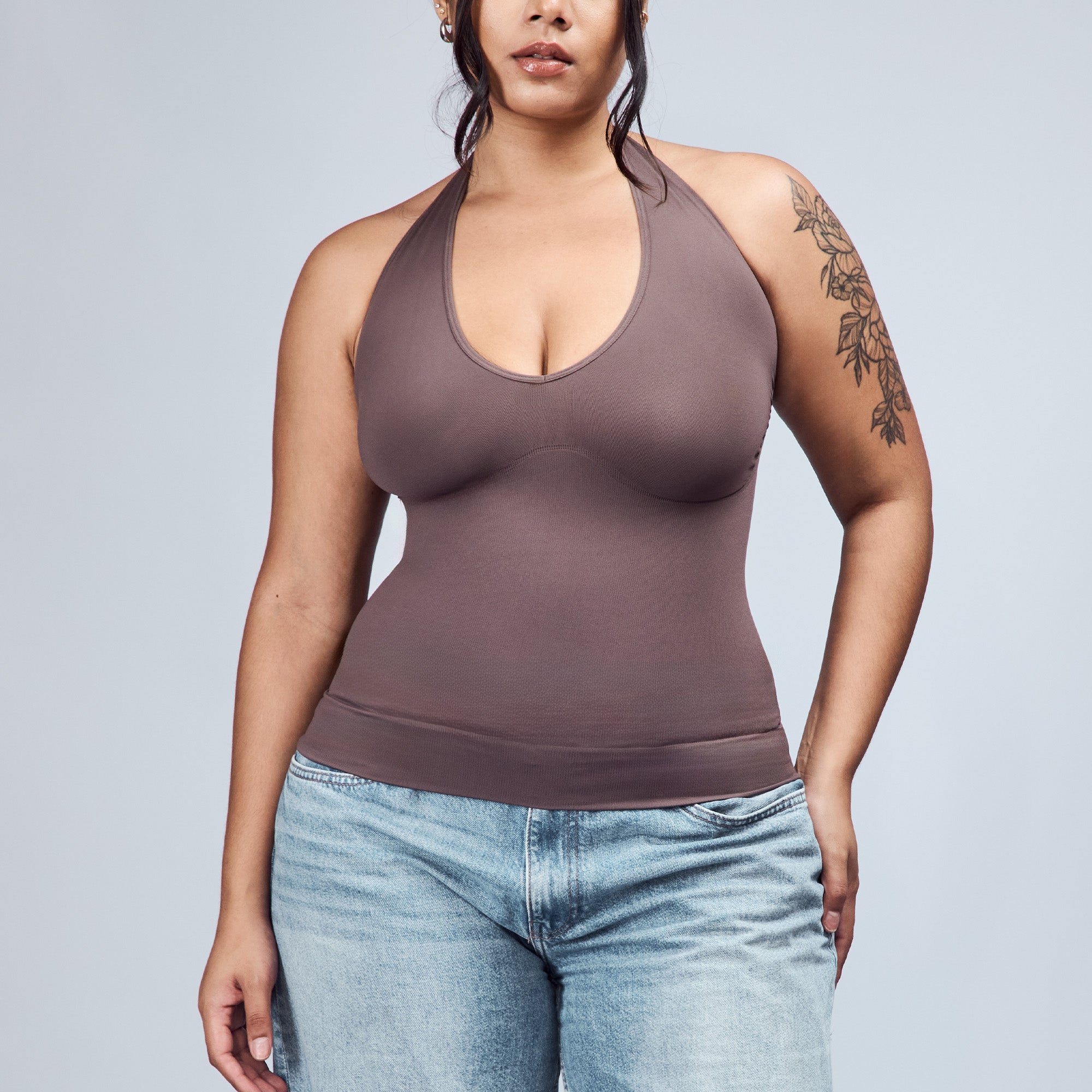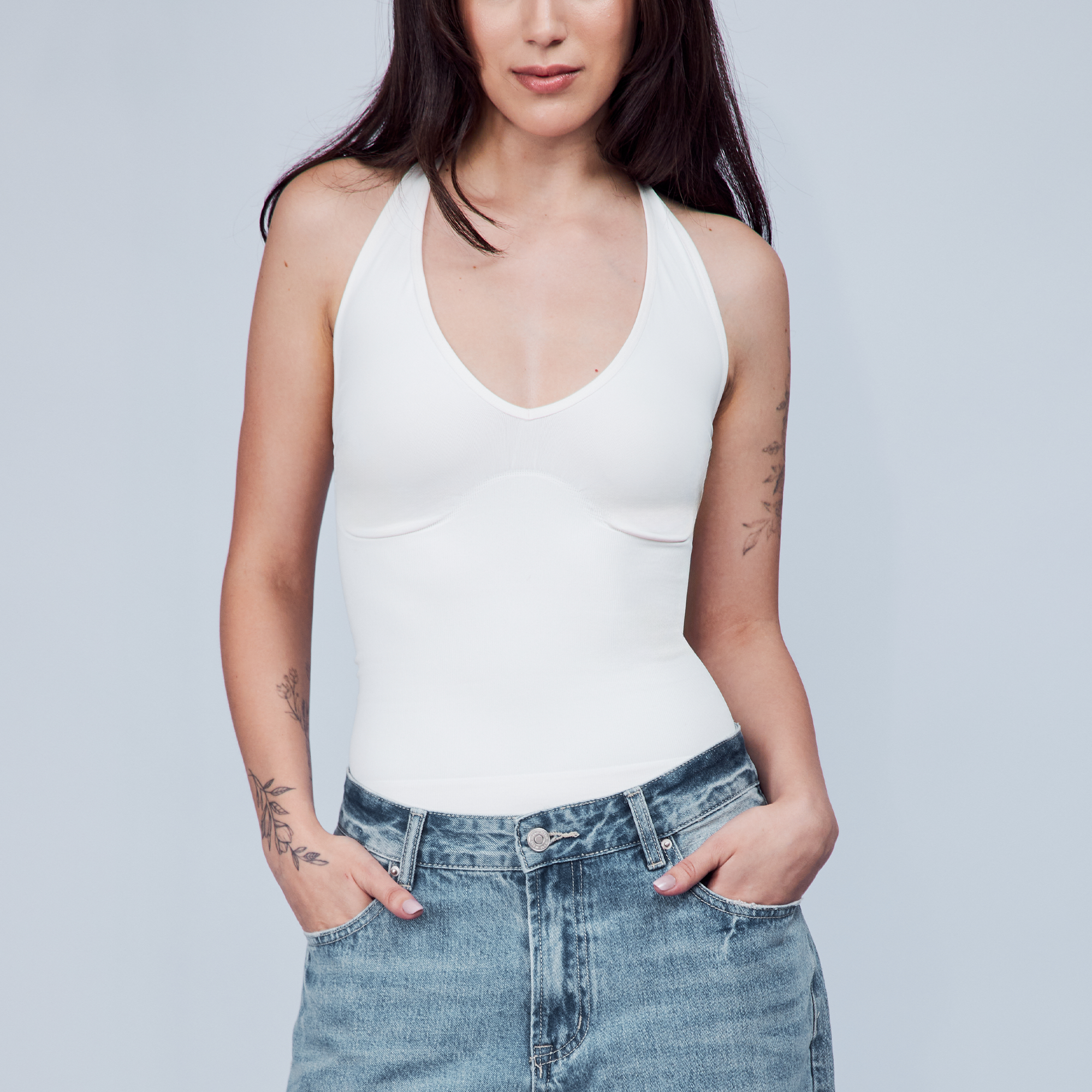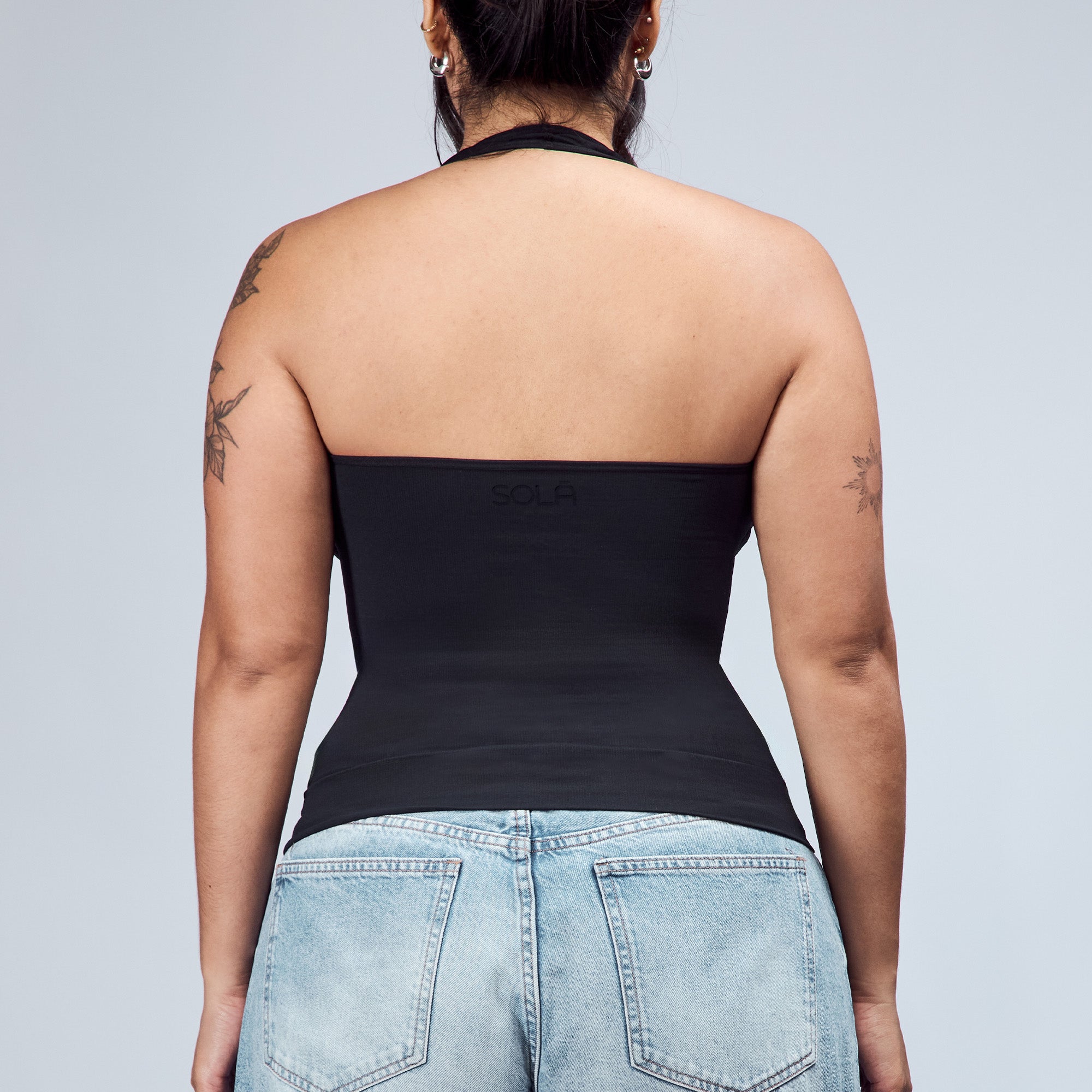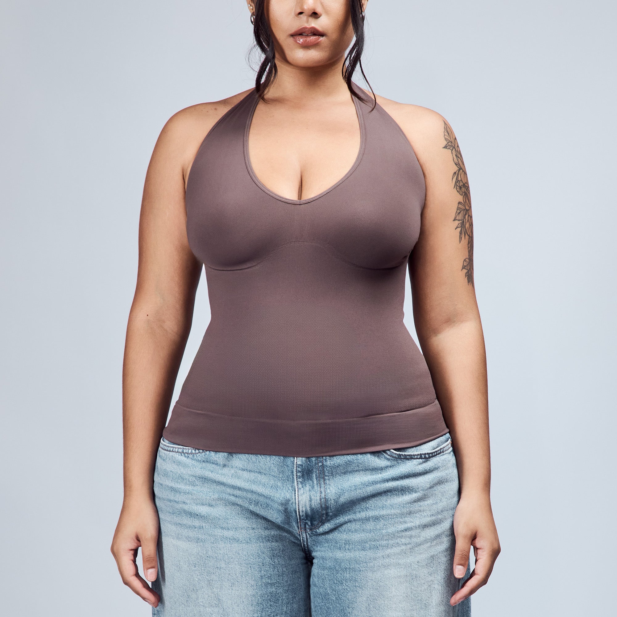 The Hugging Halter Top is a medium-compression shapewear with a flattering plunging neckline and a low-back silhouette. It offers a snug yet comfortable compression through the waist. Versatile and easy to wear, it’s perfect for layering or styling on its own.