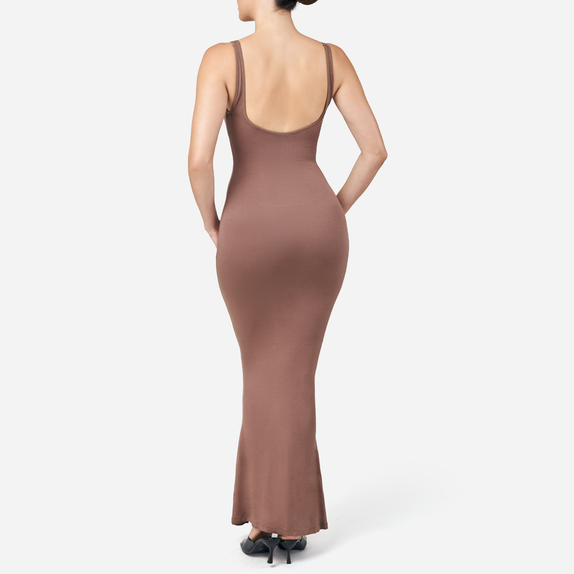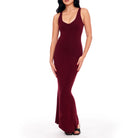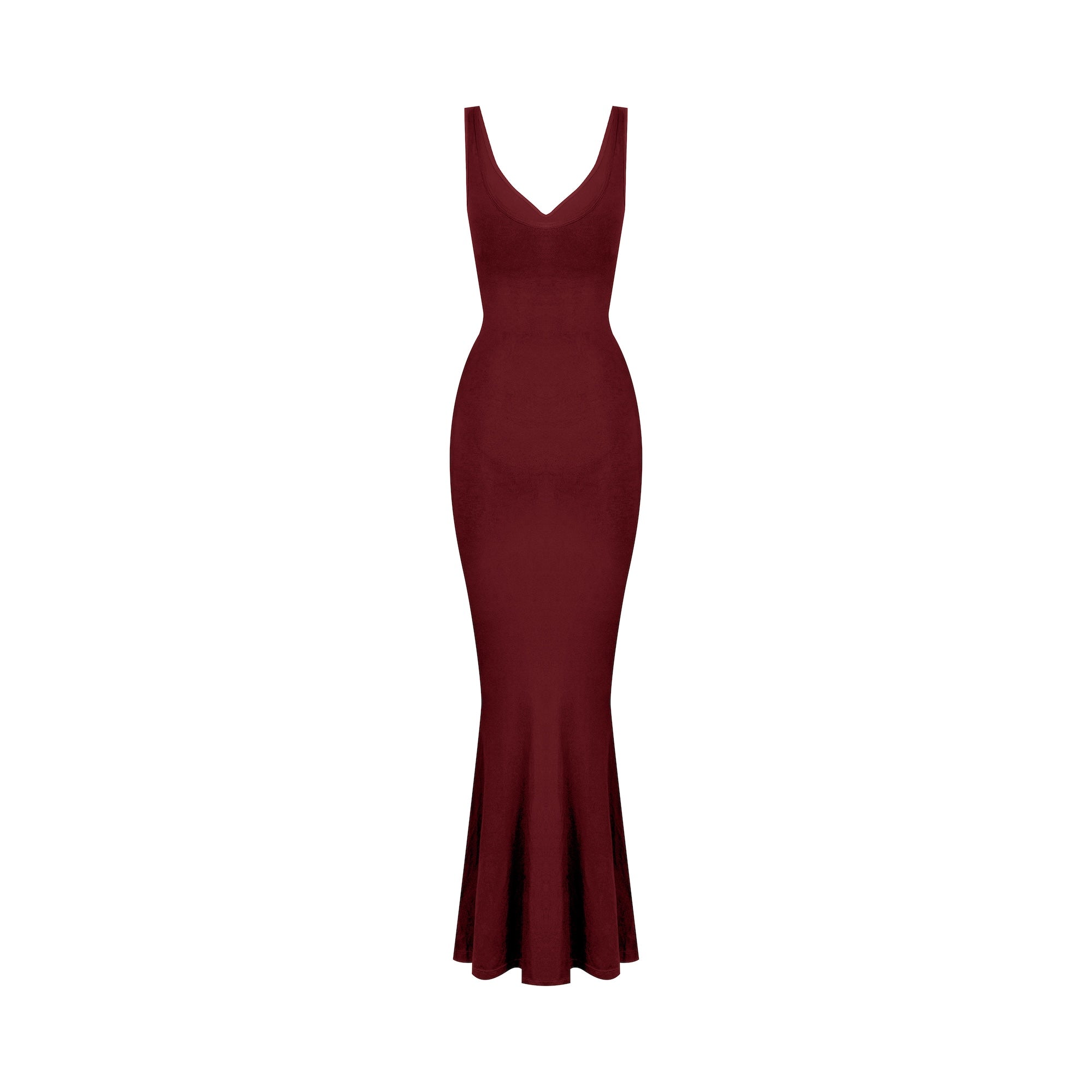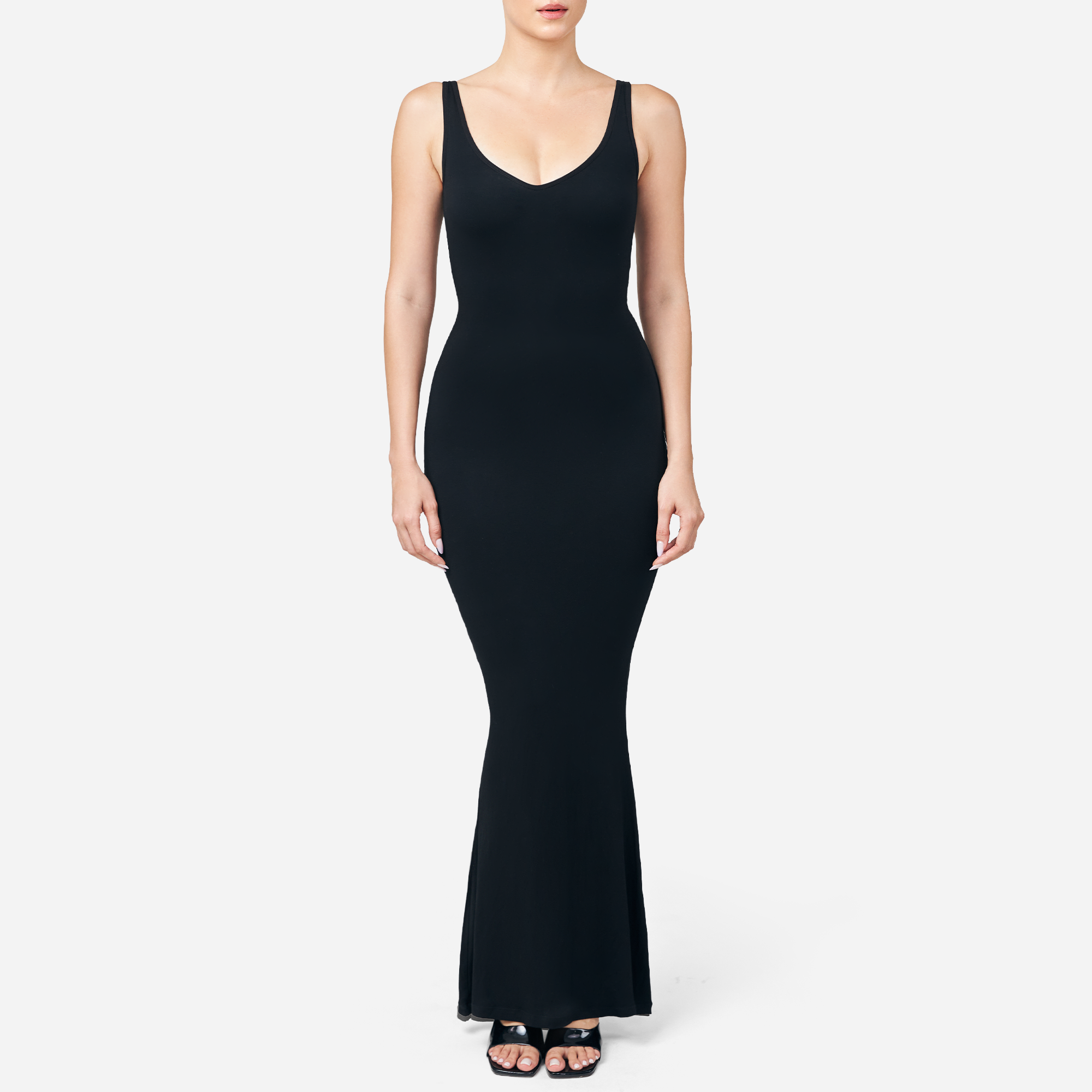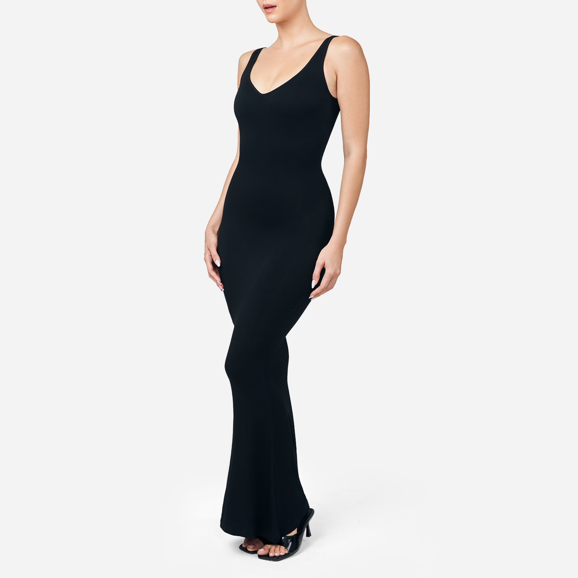 A dress and shapewear in one, designed to smooth, sculpt, and support. The Plunging Sculpting Maxi Dress features a built-in mid-thigh shapewear bodysuit that enhances the bust, cinches the waist, lifts the butt, and sculpts the thighs for a flawless silhouette. It has a plunging neckline that highlights the décolletage, scoop back, and a romantic flared cut that gracefully moves as you walk.