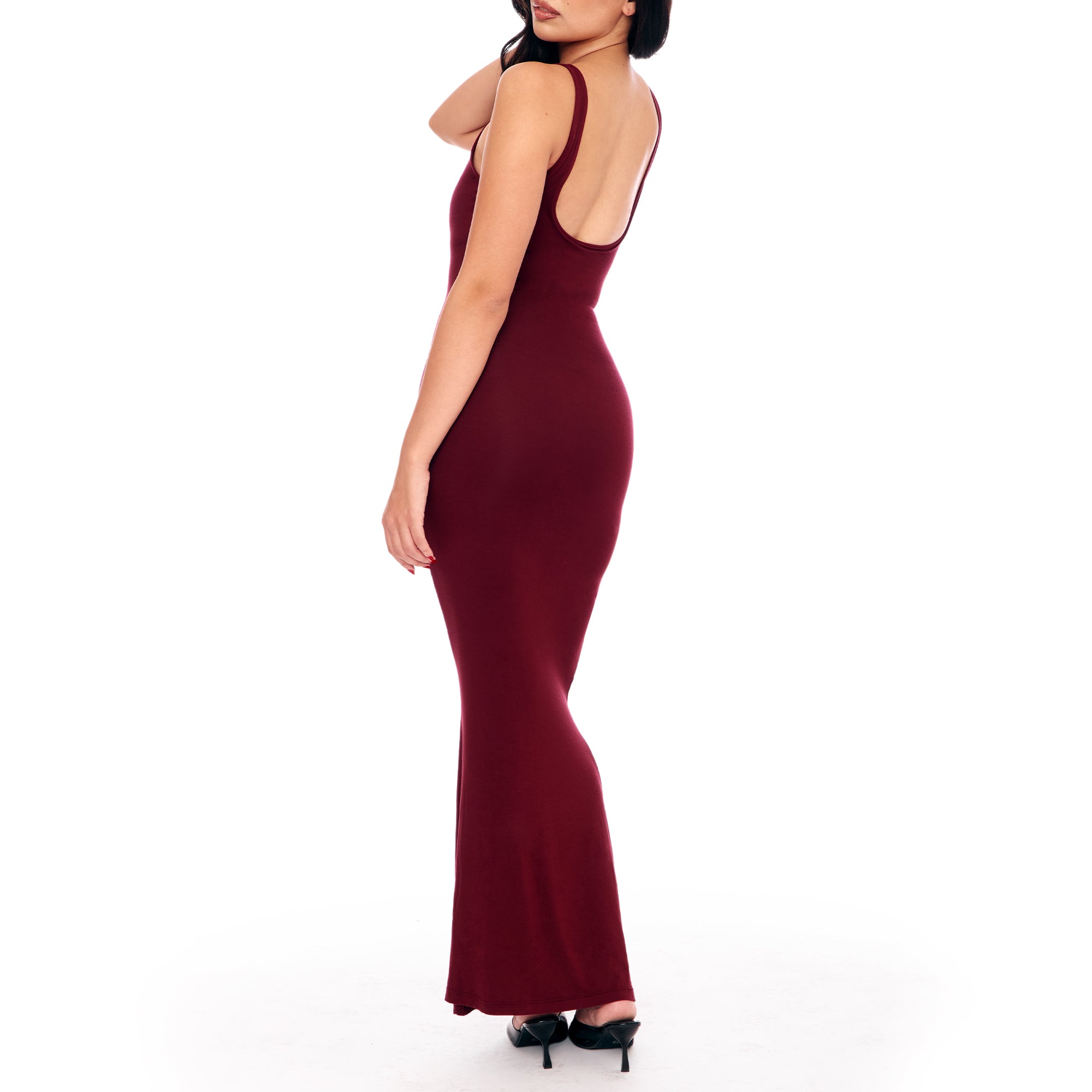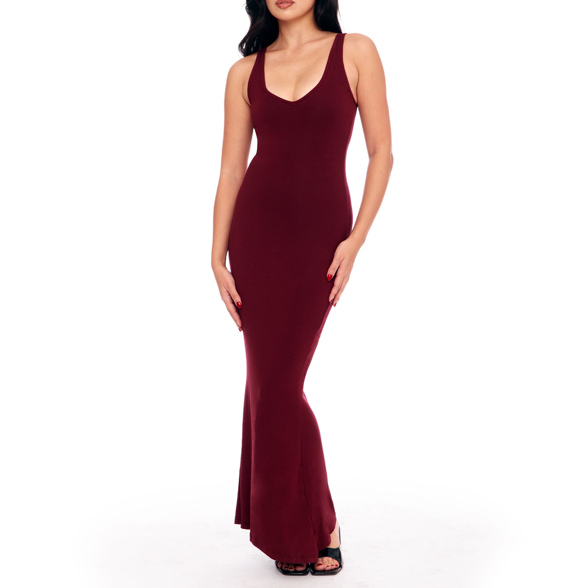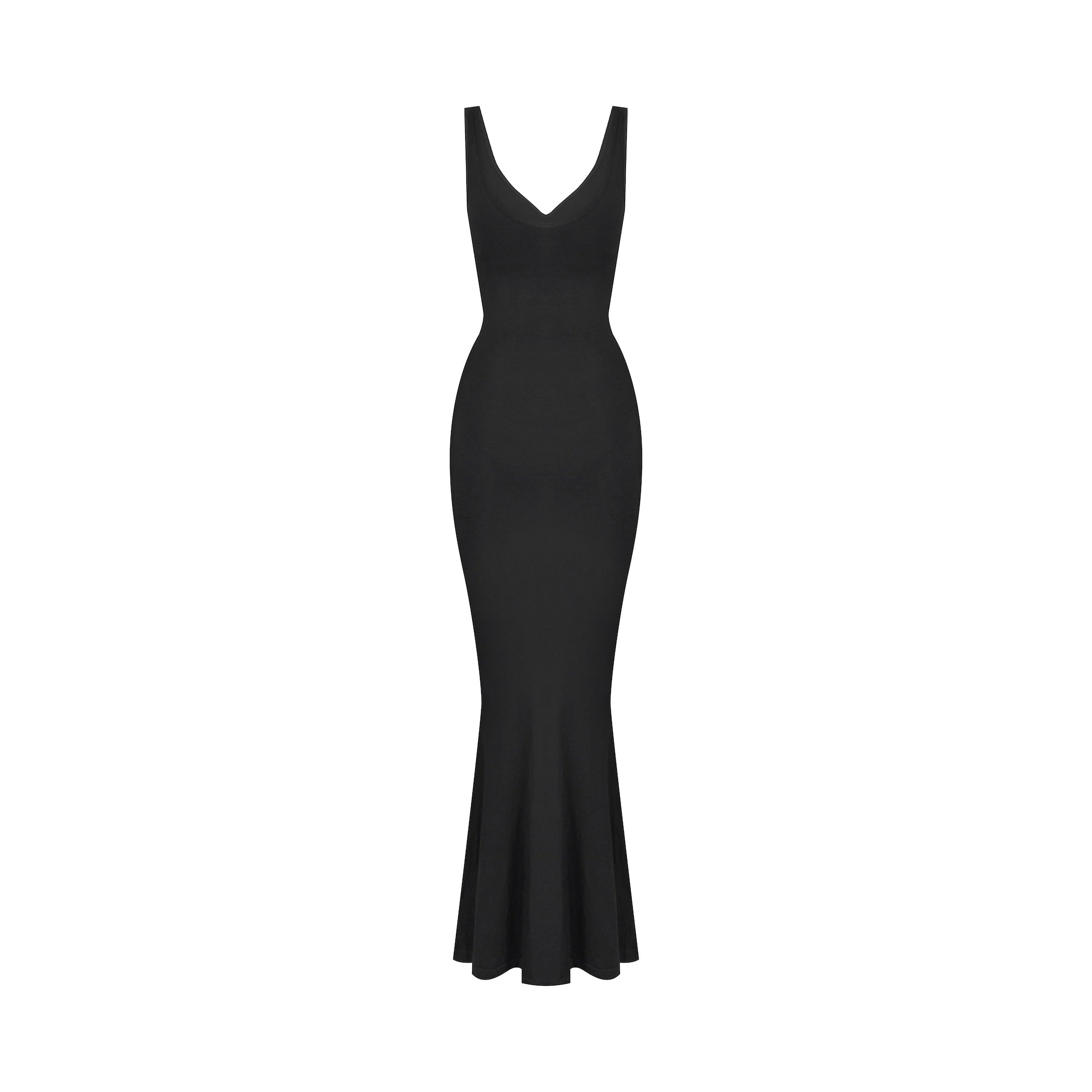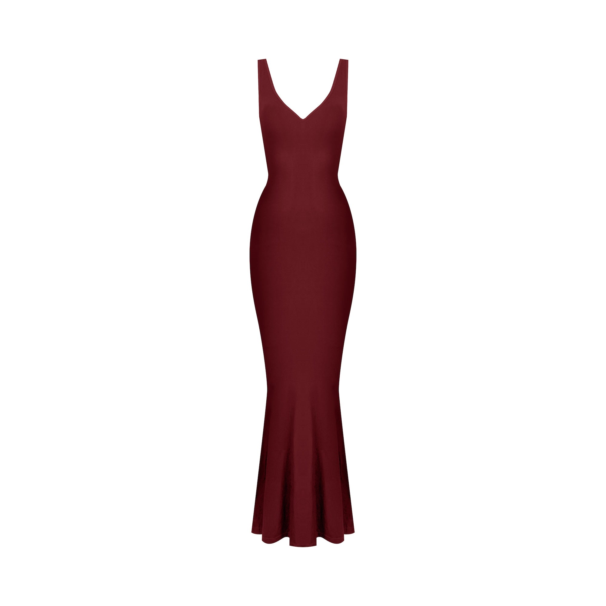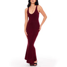 A dress and shapewear in one, designed to smooth, sculpt, and support. The Plunging Sculpting Maxi Dress features a built-in mid-thigh shapewear bodysuit that enhances the bust, cinches the waist, lifts the butt, and sculpts the thighs for a flawless silhouette. It has a plunging neckline that highlights the décolletage, scoop back, and a romantic flared cut that gracefully moves as you walk.